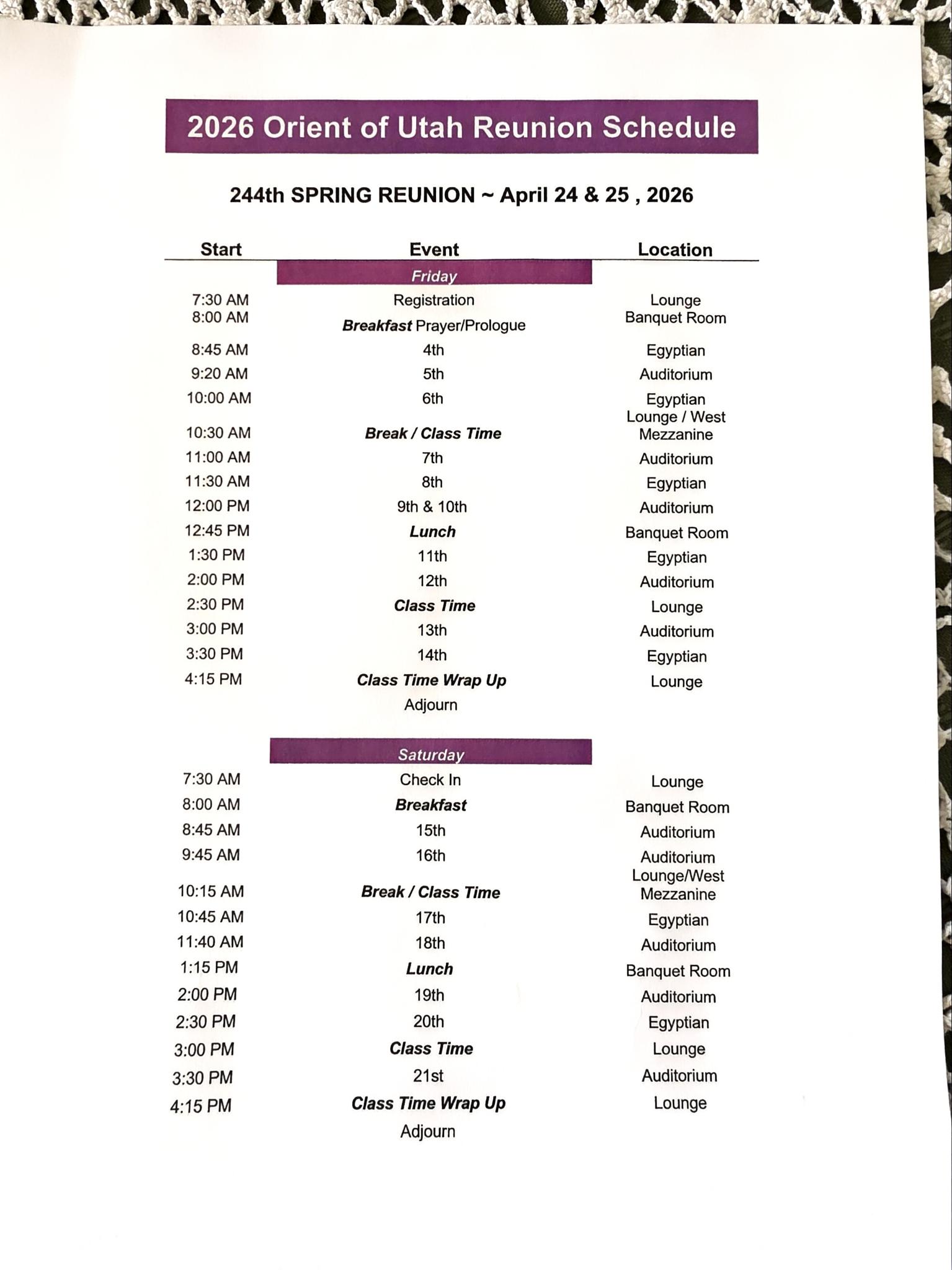 The 244th Reunion of the Valley of Salt Lake will be held on April 24th and 25th at the Salt Lake Masonic Temple.